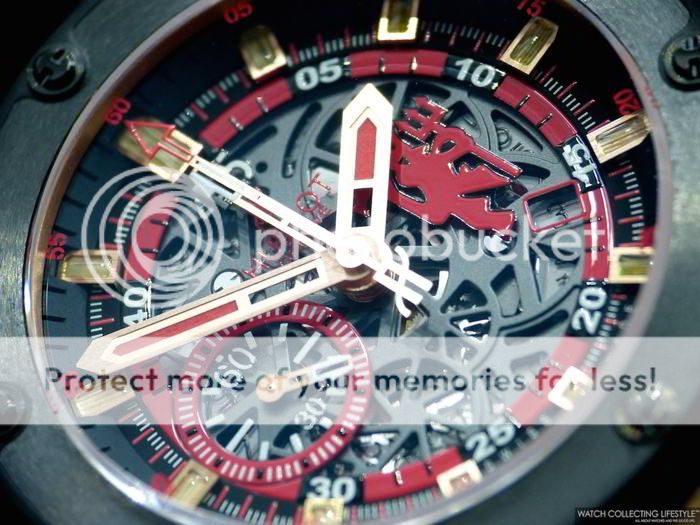 Các Hublot King Power Manchester United Limited Edition ref 'Red Devil. 716.OM.1129.RX.MAN11 là một chiếc đồng hồ rất đặc biệt như là một phần của đồng hồ tính năng DNA từ sân vận động Old Trafford thực tế. Nếu bạn nhìn kỹ vào các đánh dấu giờ -these áp dụng yếu tố này là một chút màu xanh lá cây trong giai điệu như họ đang thực sự làm bằng cỏ nổi tiếng từ sân vận động MU.